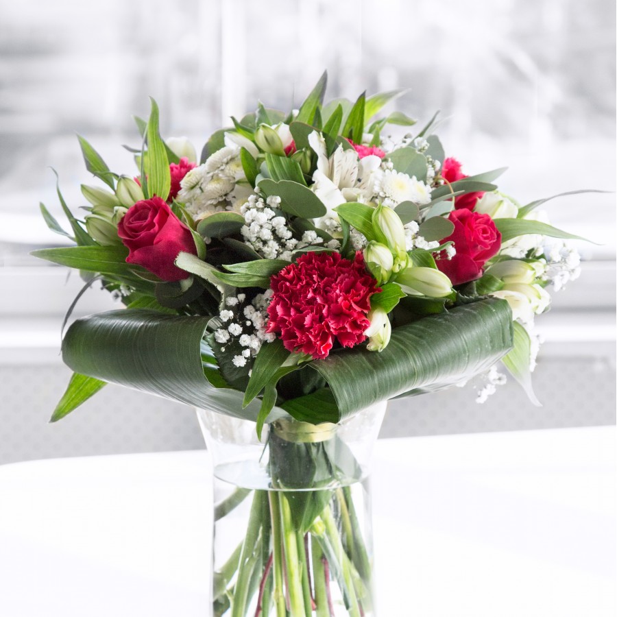 Indulge in the stunning beauty of our Luxurious Blossom Ensemble. Featuring rich red roses, crisp white chrysanthemums, and soft gypsophila, this bouquet is artfully arranged with white alstroemeria and aspidistra leaves for a truly unique design.